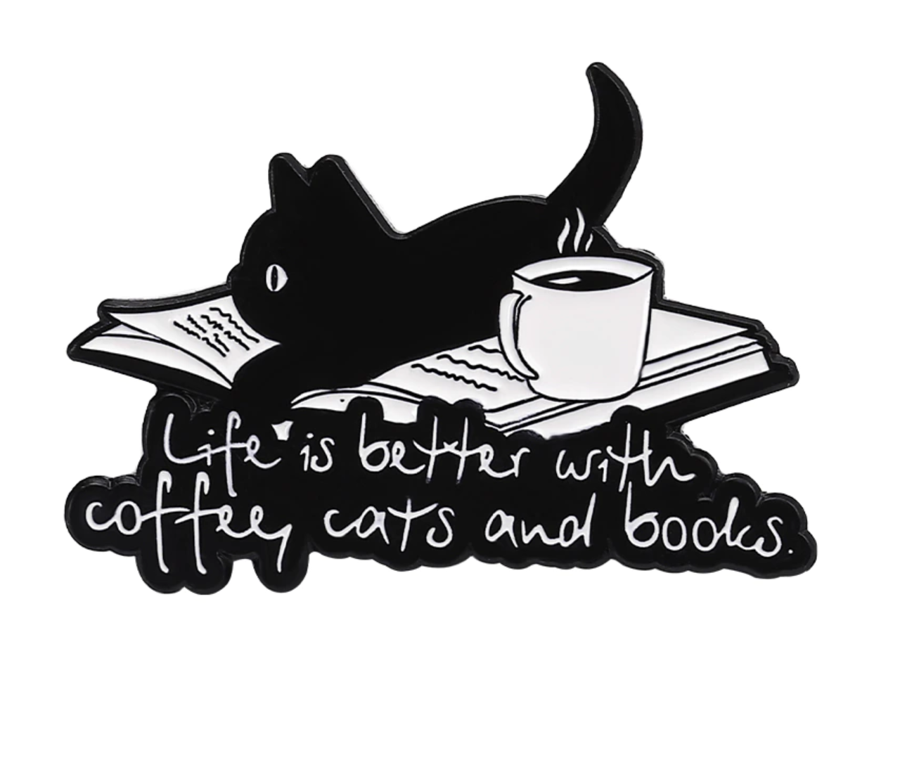"LIFE IS BETTER WITH COFFEE CATS AND BOOKS" PIN