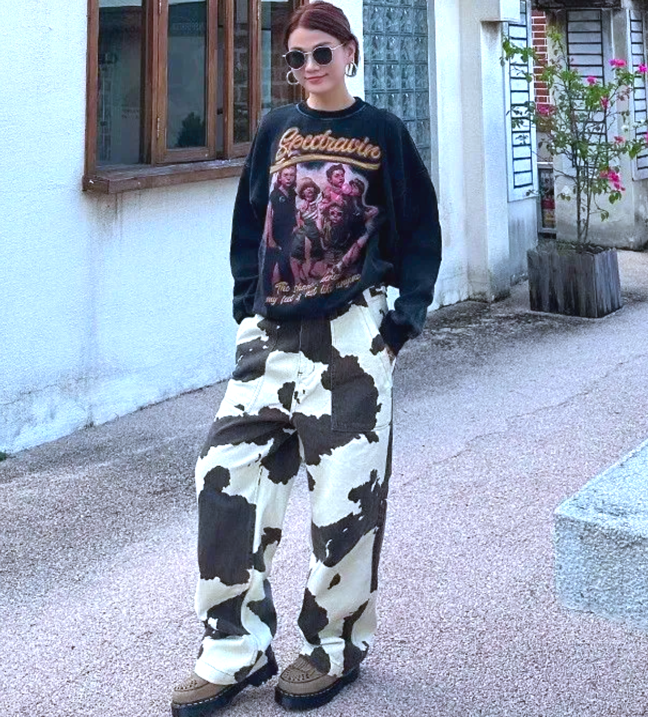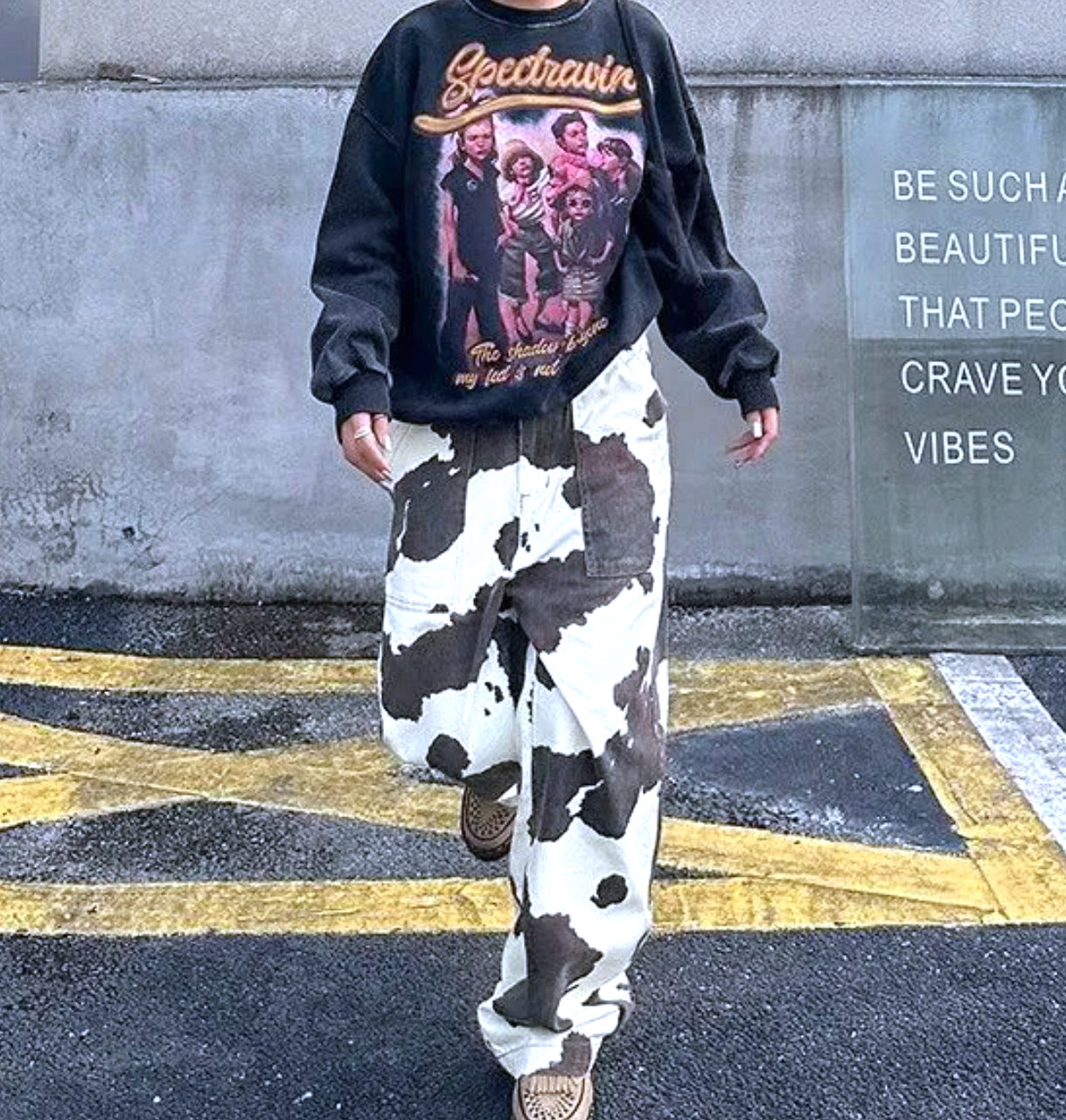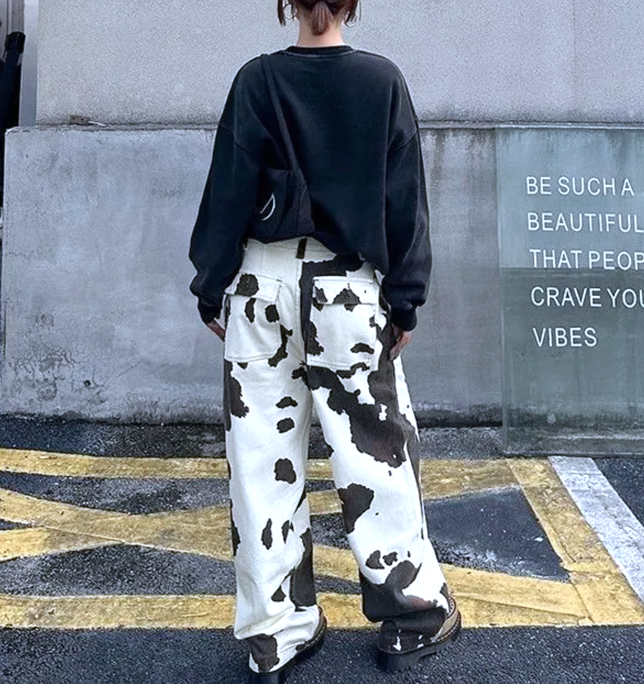 MID RISE COW PRINT WIDE LEG JEANS