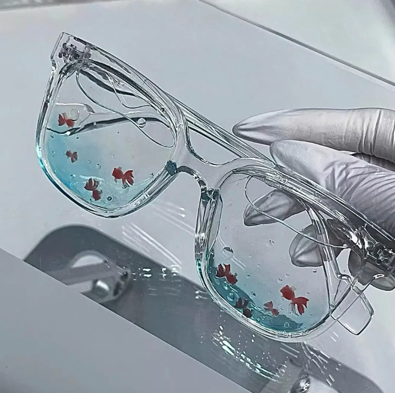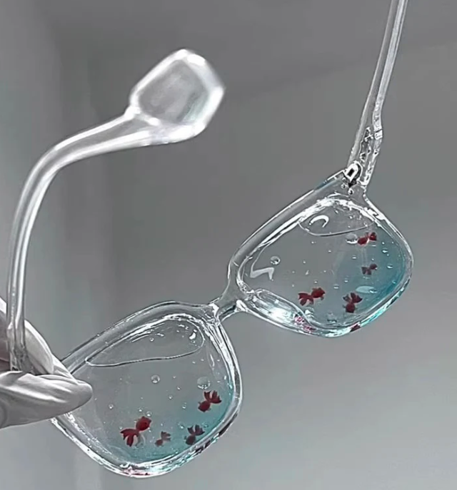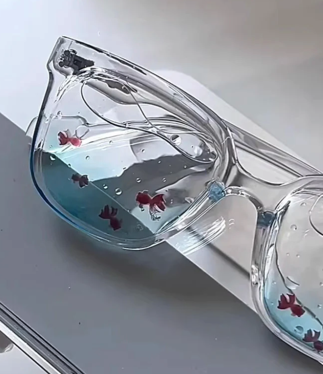 This aesthetic goldfish glasses featuring a transparent frame filled with liquid and floating fish charms. The see-through construction creates an aquarium illusion, making each pair look like a mini fish tank you can wear ✨