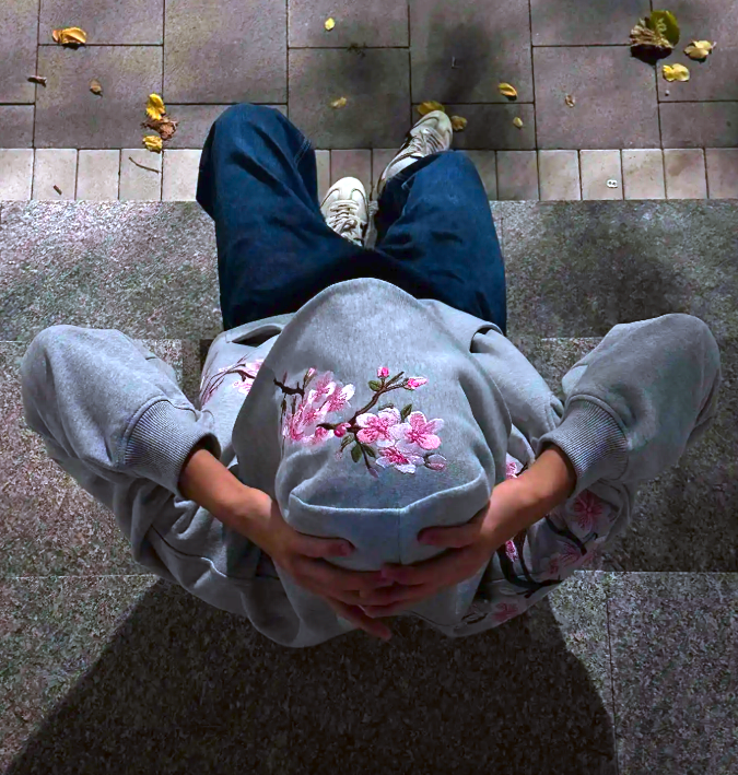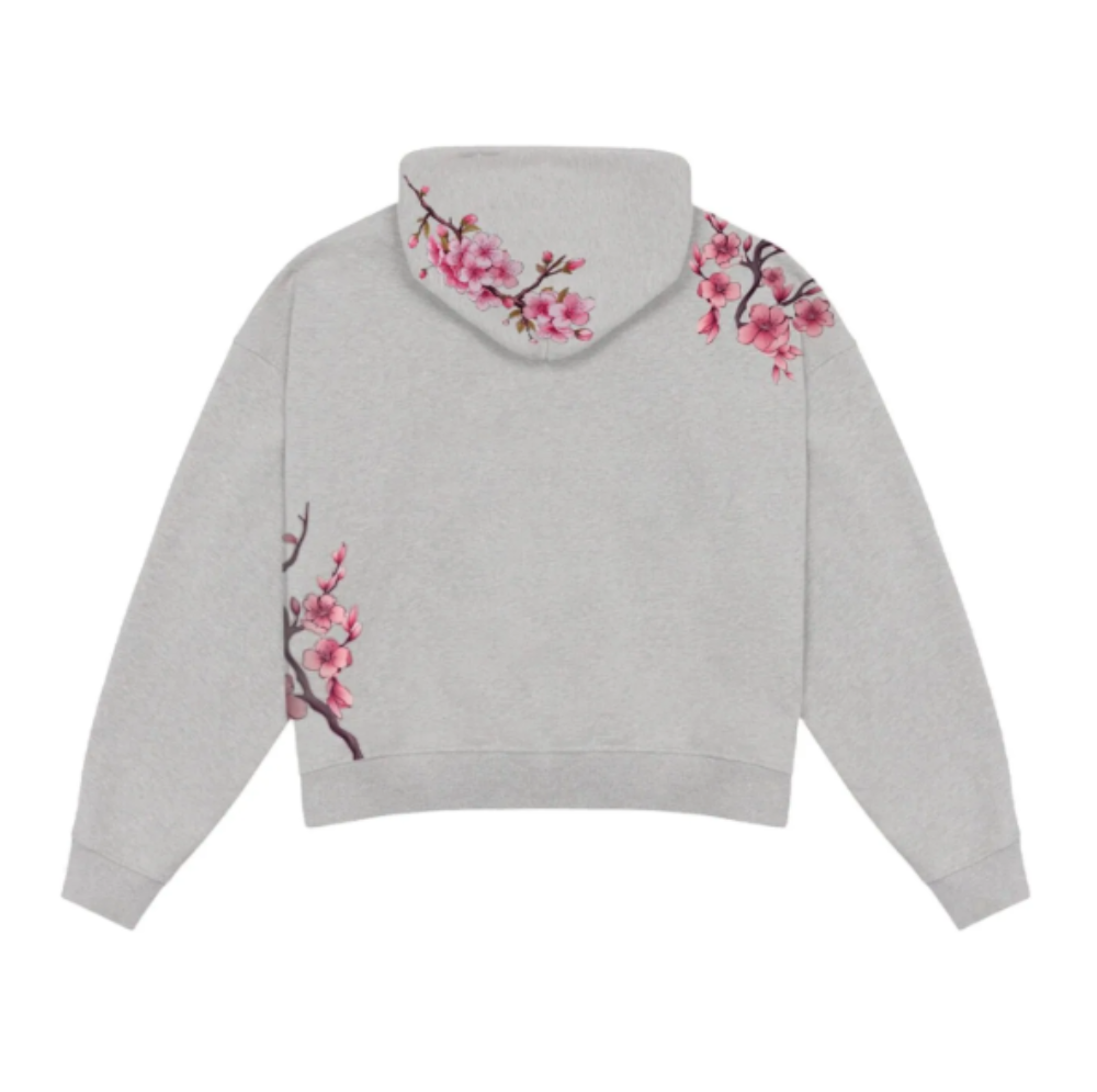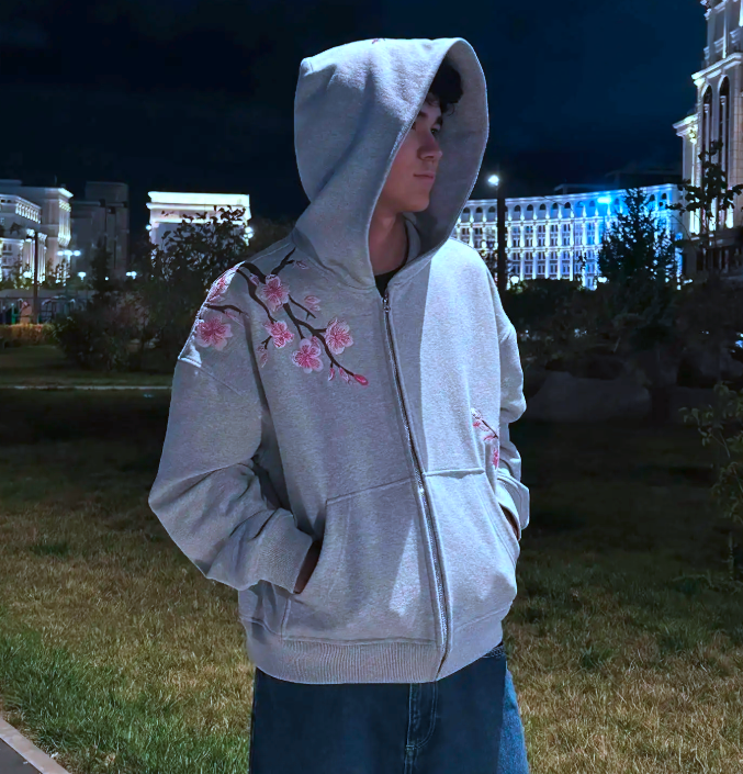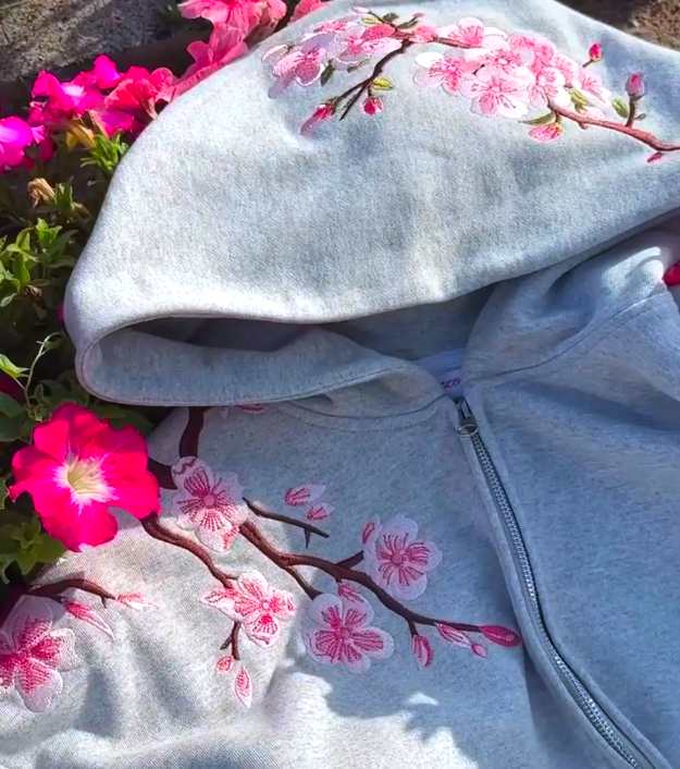 Soft heather grey zip hoodie with delicate hand-embroidered sakura branches. Cozy, beautiful, timeless.