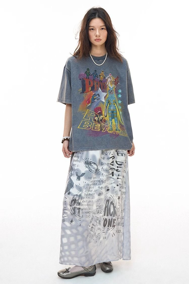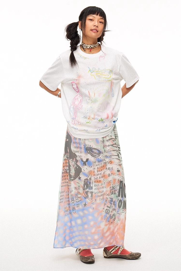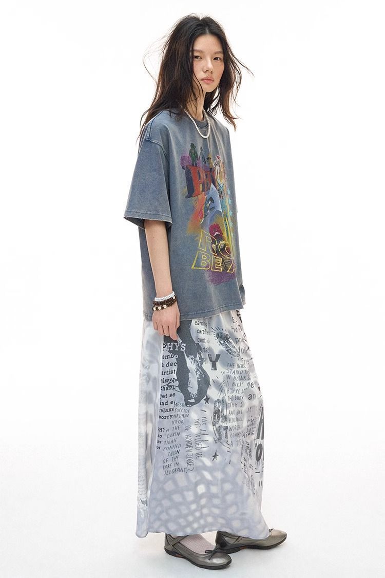 Beam up your wardrobe with this dreamy pastel tie-dye maxi skirt featuring a mysterious alien silhouette and scattered graffiti-style text prints. Flowy, comfy, and totally out-of-this-world – perfect for channeling extraterrestrial vibes! 👽✨🌈